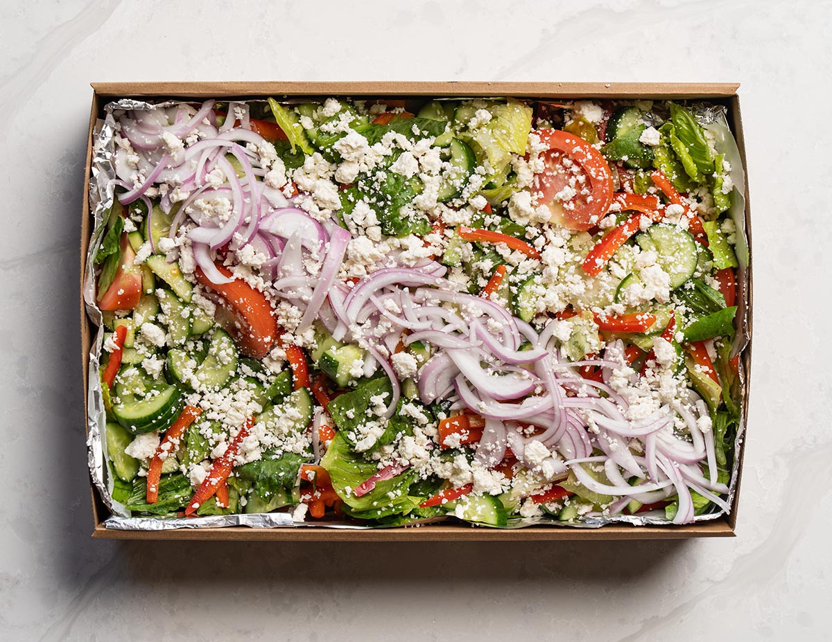 A zesty, Mediterranean-style salad made with vine-ripened tomatoes, crisp cucumbers, red onion, fresh capsicum, and creamy feta, tossed in a traditional olive oil lemon dressing. This vegetarian classic adds freshness to every table.