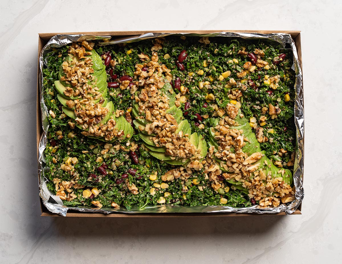 A power-packed vegan superfood salad made with finely shredded kale, fluffy protein packed quinoa, and creamy slices of fresh avocado, mixed with Baby corn and red beans for extra protein health hit and tossed in a light umami Japanese inspired vinaigrette, itโs refreshing, nutritious, and full of flavour. Ideal for health-conscious guests and modern catering tables.