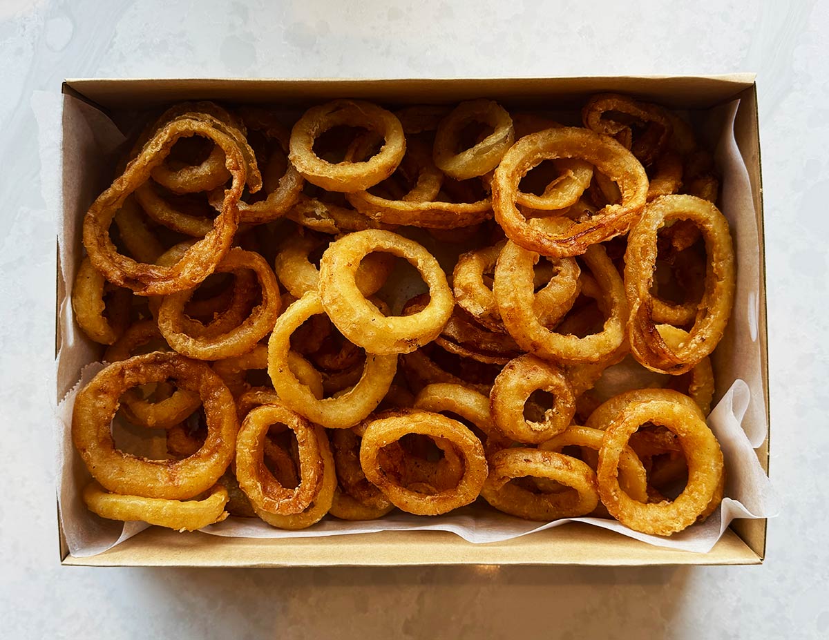 Crispy, battered onion rings cooked to golden perfection. Perfect for sharing and adding a satisfying crunch to any catering order. Image shows our XL serving size.
